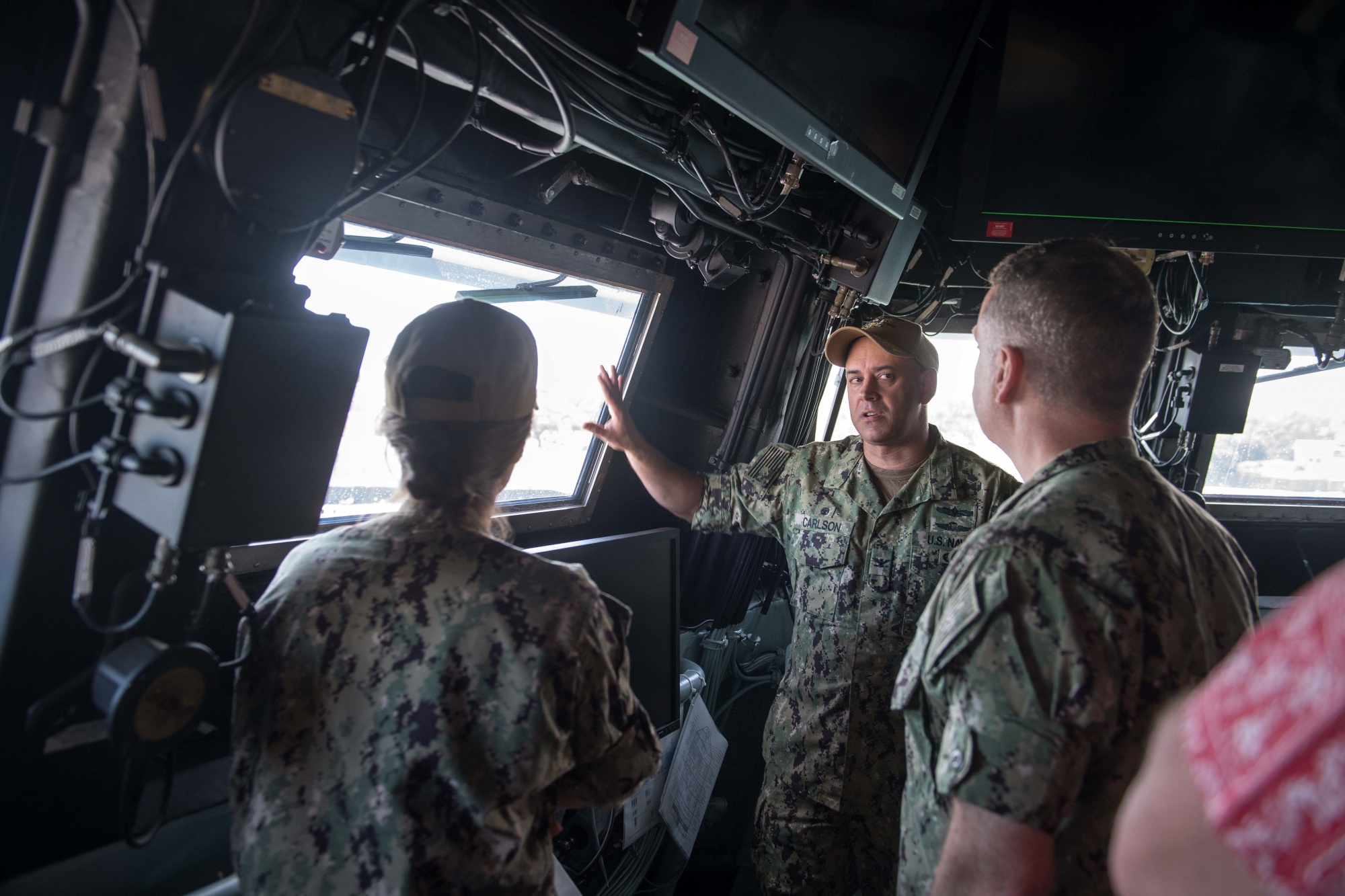 Pearl Harbor, Hawaii (April 2, 2019) Capt. Andrew Carlson, center, commanding officer of the guided-missile destroyer USS Zumwalt (DDG 1000), speaks to Rear Adm. Kristen Fabry, left, director of logistics, fleet supply and ordnance, for the U.S. Pacific Fleet, and Rear Adm. Jim Waters, director of Maritime Headquarters at the U.S. Pacific Fleet, during a tour of the ship. (U.S. Navy photo by Mass Communication Specialist 2nd Class Jonathan Jiang/Released)
