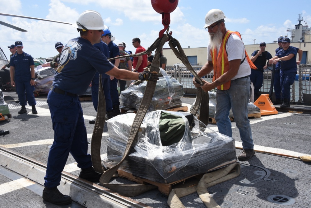 On Thursday, the crew of the U.S. Coast Guard Cutter Bear offloaded about seven tons of marijuana and nearly two tons of cocaine. The drugs are worth more than $60 million wholesale.
