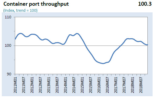 Only the index for container port throughput remained relatively buoyant at 100.3, showing on-trend growth. Front-loading of imports ahead of anticipated U.S.-China tariffs may have sustained container shipping to some extent, while technical problems in the German automotive sector may have contributed to weakness in automobile production and sales.