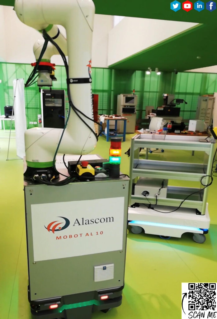 Alascom ha sviluppato una soluzione di robotica collaborativa mobile combinando le peculiarità della robotica collaborativa di nuova generazione e la mobilità offerta dai nuovi robot mobili autonomi (AMR – Autonomous Mobile Robot).