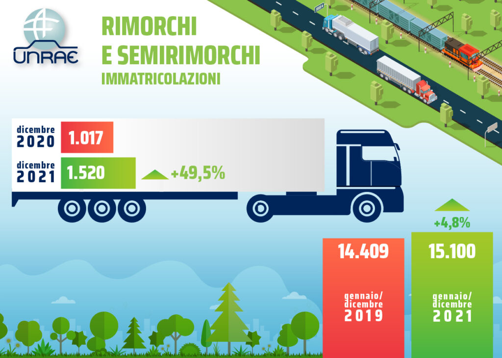 Il comparto dei mezzi trainati nel 2021 registra un segno positivo (+4,8%) rispetto al 2019, anche se leggermente inferiore rispetto al +6,2% del settore veicoli industriali, mentre il confronto con il 2020 rimane ancora improprio. Il dato del solo mese di dicembre, superiore al 40% sia verso il 2019 che il 2020, è dovuto alle dinamiche di fine anno nei budget delle aziende e non è indicativo di tendenze.